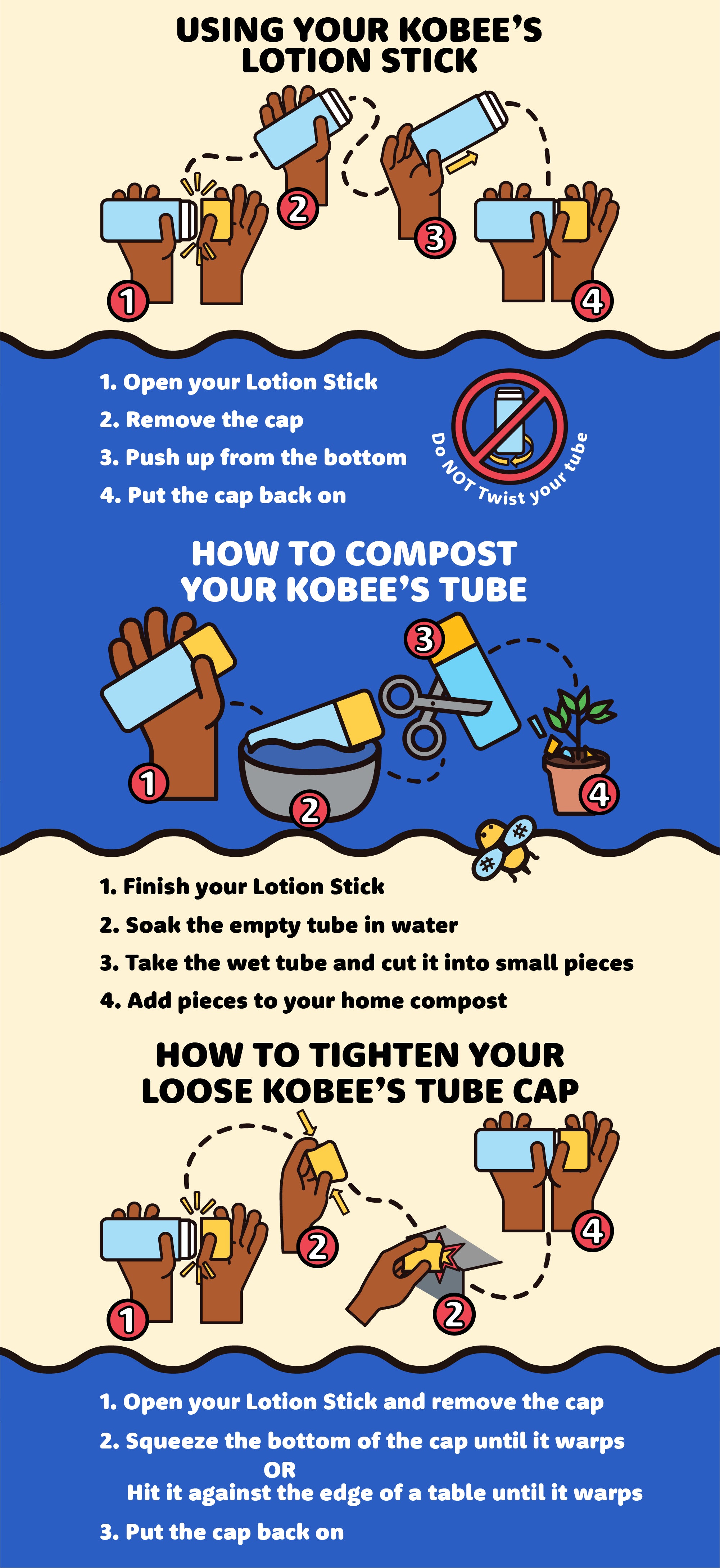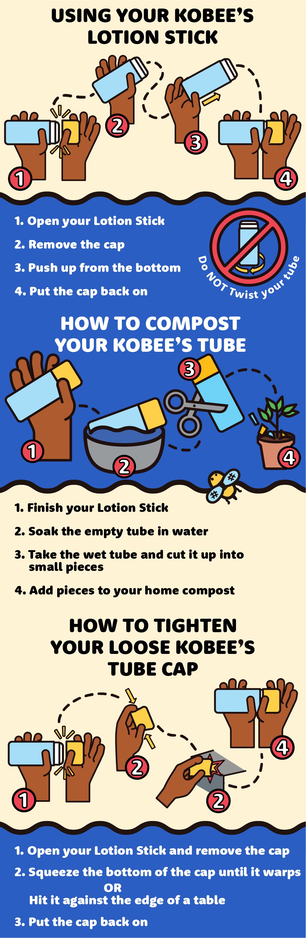 - To Extend The Life Of Your Lotion Stick: KOBEE'S Lotion Stick tubes are made from compostable cardboard, so naturally some wear and tear are to be expected. To best preserve your Lotion Stick(s), please store at room temperature and avoid direct sunlight and moisture. Be careful not to leave it in a hot car or mailbox as this might cause the product to melt into the packaging.